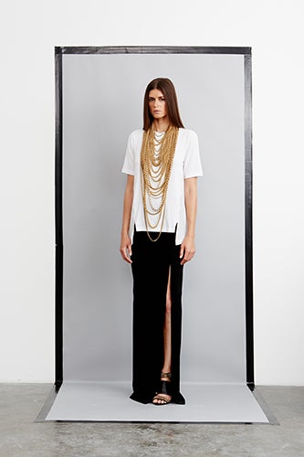 We never thought we'd see the day when a Jenni Kayne collection would feature hip-length gold chains... and we really mean chains — there are piles of 'em! It's an unexpected, yet most welcomed, twist for the L.A.-based designer, maker of the ubiquitous, criminally-chic d'orsay flat in every color and texture, whose creations have become synonymous with clean minimalism and on-trend touches.