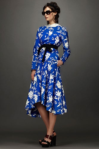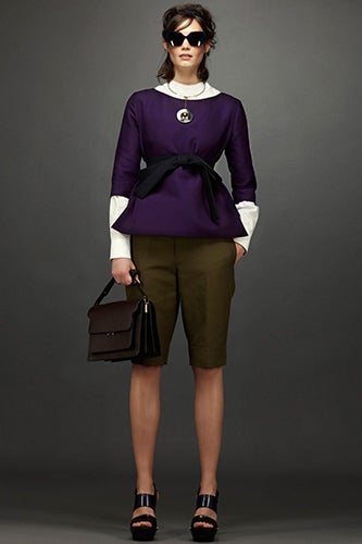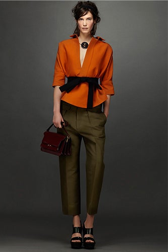 Last season, Marni resort '13 consisted of a notably pastel color palette, but this year, we’re faced with bold hues and fearless structuring to match. If there’s one thing Marni’s Consuelo Castiglioni absolutely never fails at, it’s shape. The tailoring virtuoso, who could probably turn a cardboard box into an architectural masterpiece, has seemingly drawn from traditions of the '40s to guide the collection. Throughout the war-torn decade, European artists and intellectuals were flocking to the States and bringing fashion in hand. Of those Euro-adoptees, the belted waist and peplum silhouette were two of the most celebrated and are reappearing today via Marni Resort '14.