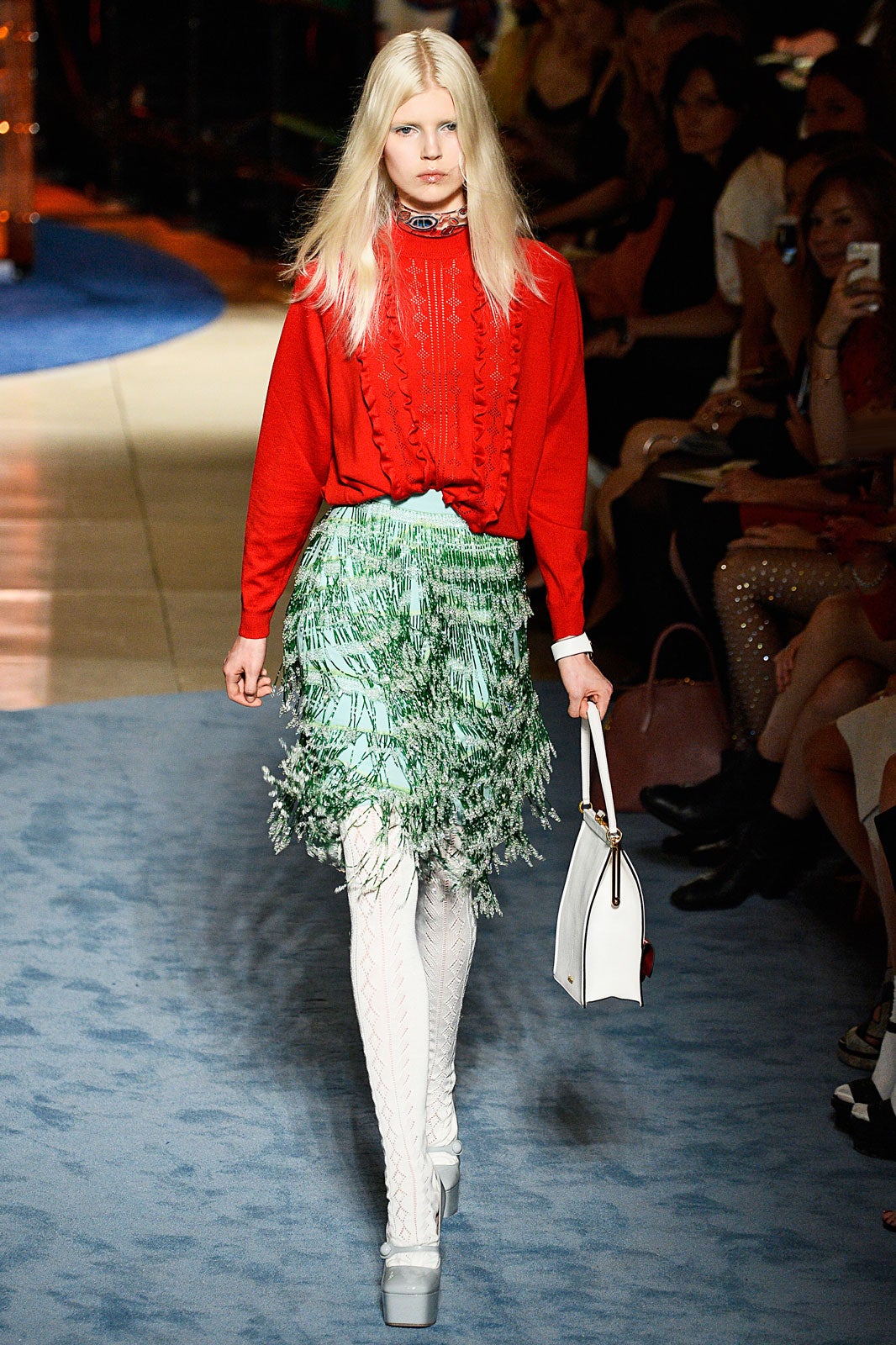 Even more so than black and blue or pink and red, wearing red and green together might be fashion's biggest no-no color combinations. Most times, a red-and-green look can make you look like a Christmas cheerleader, even if you are wearing it in July. However, Miu Miu showed us one way to mix the two that feels fresh, vibrant, and fun — and not like you've just had too much eggnog.