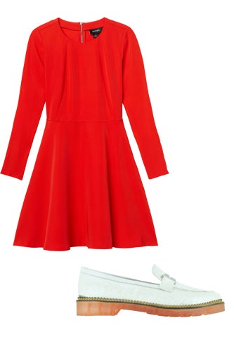 A bright, tomato-red mixed with a faded, pastel green looks killer — just make sure the red is your standout hue here and the green is more seafoam than celery, and you should be good to go. For real life, skip the white tights, and wear it with cognac leathers accessories for a '70s vibe.