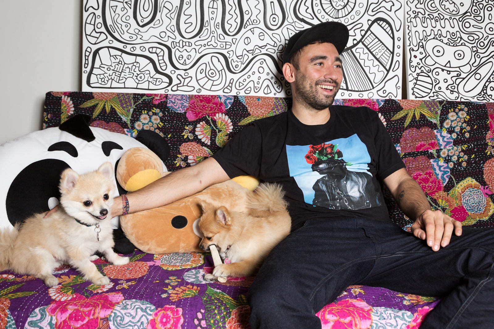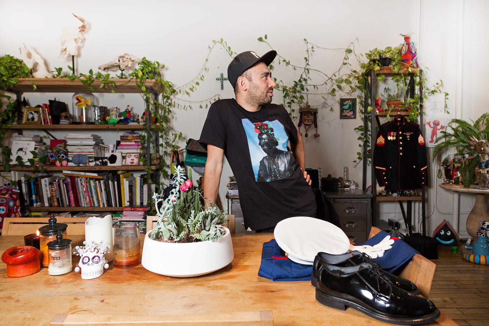 When you imagine the man behind Lady Gaga's meat dress and back-to-back V Magazine cover looks, your fantasy is probably very different from the reality. Nicola Formichetti, Mother Monster's former fashion guru and the current creative director at Diesel, is neither outlandish nor flamboyant in his dress. When we meet at his apartment, he's wearing a simple uniform of black jeans, a black tee, and plain black sneaks. Formichetti is soft-spoken, down-to-earth, and instantly welcoming. His home, however, is a little more in line with our creative daydreams of where Gaga's style pro should reside. Chock-full of colorful knick-knacks, from Harajuku-themed pillows to dinosaur statues and oh-so many houseplants, it's bright, inspiring, and just a bit over the top.