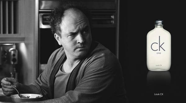 This is one of those erasers-on-the-end-of-pencils ideas that you kick yourself for not thinking of first. As you've gleaned from the headline, some genius (or geniuses) has elided the stage name of America's most prominent indie comedian, Louis C.K. and the title of Calvin Klein' first unisex fragrance, CK One, to get Louis CK One. There's a quiet brilliance there. Let it sink in.