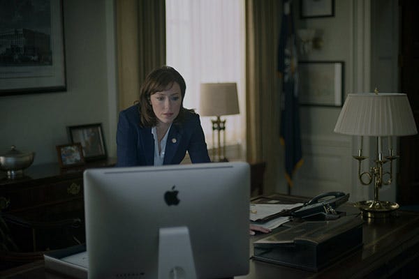 Netflix has released new images from the highly anticipated season two of House of Cards. The new pics don't tell us too much, plot-wise, but there are numerous shots of Robin Wright looking either very stern and/or very poised and even more of Kevin Spacey in exchanges with other suited men. Both are telling that Francis Underwood (Spacey) will be up to his usual schemes and ploys in the second installment of the series.