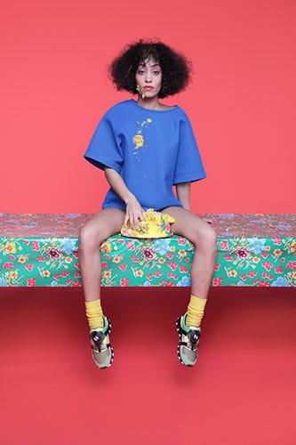 The Girls of Blaze Disc Collection is a riotous display of sun-saturated color and trademark kooky styling. At Knowles’ behest, denim designer Gerlan Marcel, visual artist Hisham Bharoocha, and womanswear design duo Darlene and Lizzy Okpo each added their own stylistic interpretations to the project.