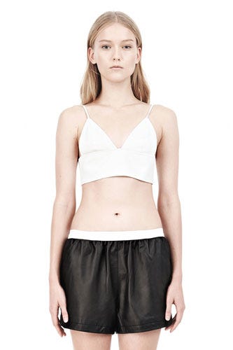 What with the sheer trend still going strong (not to mention its ubiquity within Wang's own spring '14 collection), it's about time a designer fashioned underpinnings to wear with these ever-present, see-through looks. And, by underpinnings we definitely aren't referring to anything lacy or feminine. Instead, we're talking leather bralettes, satin triangle bras, and enough crisscross backs and bandage straps to have you reeling with memories of your high school locker room. (We'll leave it to you to decide whether that's a good thing or not.)