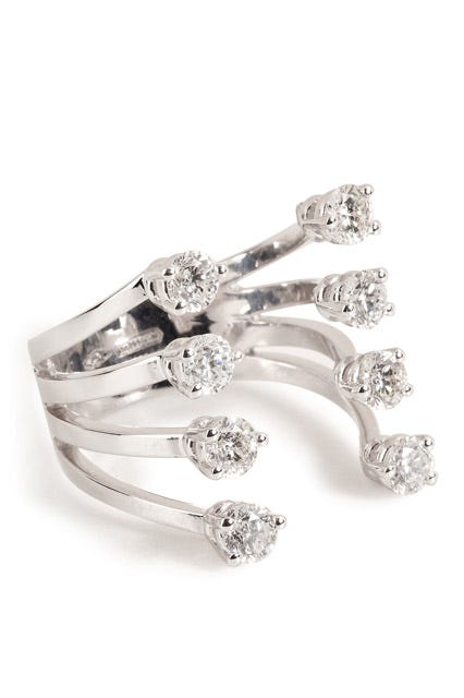 In keeping with the retail juggernaut's unconventional aesthetic, Amoruso's groom-to-be nailed it with a wonderfully offbeat Delfina Delettrez open-front diamond ring. Yes, white diamonds are involved, but this bauble is still far from ordinary. Upon further inspection, Amoruso's thin, 18-karat white-gold ring features four rows with stones on each side. Meanwhile, the open-front bands make it appear as though the diamonds are floating atop her finger, making this one truly special piece of statement bling. Leave it to the trailblazer who gave us one major online-shopping addiction to lead the way in unexpected engagement gear as well.