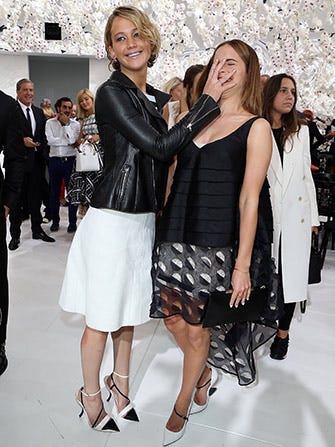 It's a testament to the popularity of Jennifer Lawrence that she can playfully shove Emma Watson in the face and still be regarded as utterly charming. A very bronzed J Lawr did just that when posing for pictures with the artist formerly known as Hermione Granger at the Dior haute couture show in Paris yesterday. Perhaps the Oscar winner saw an amazing photo opp and went for it? Maybe she was reenacting the bathroom scene from American Hustle? Could it be she just wanted to show that ridiculously perfect English rose who's boss?