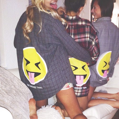 Just this weekend, Bernstein broke the news of her new, budding partnership with the 'gram shown here — appropriately ending her short blurb with four just-kidding emoji faces. She further details that this is simply the first release of the series, so we can only assume winky face and face with hearts aren't too far behind. At $44 a pop, these cheeky flannels are surely worth their weight in likes.
