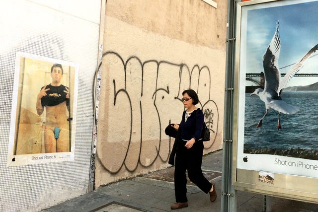 But, the two images, juxtaposed together in short-lived harmony on several San Francisco streets and BART stations before being removed, are actually a brilliant reflection on today’s smartphone culture.