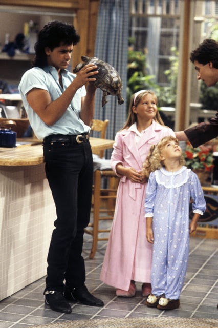I was born the same year Full House premiered, in 1987. And, by the age of nine, I was in full-on puppy love with Stamos. But, there has to be some kind of deeper reason why I thought Uncle Jesse was It. I recently asked my mom if maybe Full House was playing on the TV in the delivery room, or if maybe it was on TV a lot when I was too small to remember it. Maybe there’s a subconscious connection there. My mom confirmed that Full House was definitely on all the time when I was small, “but so were the Teenage Mutant Ninja Turtles.” And, while I have zero romantic feelings about my reptilian friends, I did 100% want to date Casey Jones. (That is a separate story.)