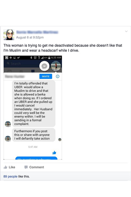 Hunter, a registered Uber driver-partner (and occasional passenger) herself, reportedly asked Martinez if she’s allowed to drive in the U.S. — since Muslim women aren’t allowed to drive in Saudi Arabia. Hunter, who is from North Carolina, also asked Martinez if she wears a headscarf while she drives. When Martinez responded that she does wear hijab while driving, Hunter immediately blocked Martinez on Facebook.