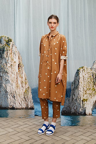 The silhouettes are simple, loose-fitting, and free of unneeded embellishments. Chambray two-pieces, shirtdress tunics, drawstring jackets, and relaxed trousers build the beginnings of the collection, with surprising cameos from gold-foil shorts and statement-making, wide-brim hats. Aside from a few sea-foam pieces and a textured, yellow skirt, the color palette is pretty tame, sticking closely to neutrals and indigo. At this point, all we want to do is slip into a cool, spring creation from Creatures of Comfort and jet off to Corsica. And, trust, a flip through the clean, beautiful lookbook ahead will probably leave you with the same sentiment.