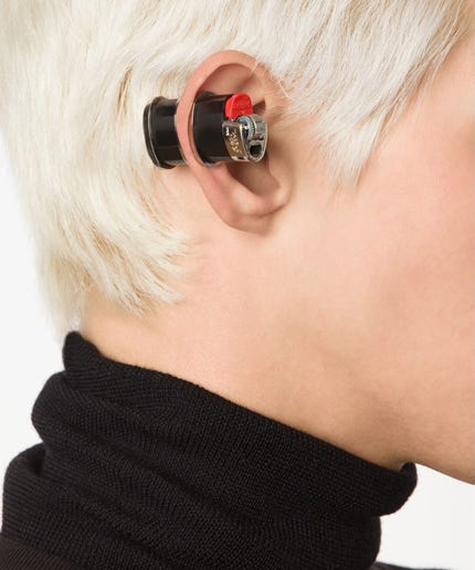But, consider this: What is designer Shayne Oliver — who has never been one to stick to the ordinary — trying to say with a pair of earrings that are, essentially, just a branded lighter? Here, with "HBA" stamped across the bottom, this average bodega purchase becomes a statement piece. Now, it's a luxury — and one you don't even need pierced ears to wear.