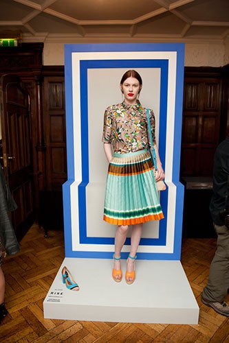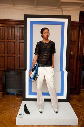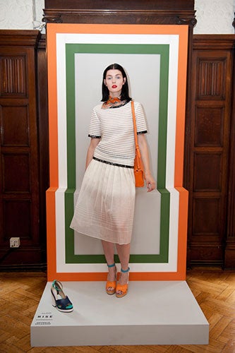 But most importantly, there is only one word available to describe the shoes and bags: awesome. The colourblock cross-body box bags and diagonally striped oversize totes are going to be the It bags for spring (sorry, these bad boys won't go on sale till April '14.) The shoes were a master class in wearability, consisting almost entirely of chunky heels that were not too vertiginous to feel that they couldn't be worn all over the streets of London.