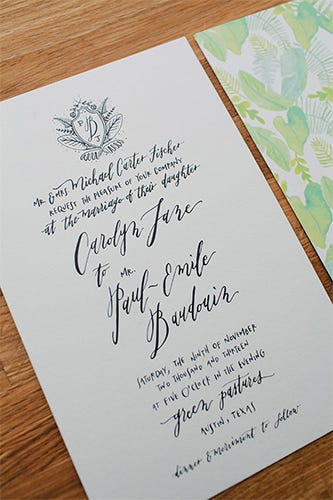 It’s easy to go with a muted and neutral wedding color palate when your venue is Green Pastures, a gorgeous Victorian home in Austin, Texas, surrounded by sprawling oak trees. Jane, the bride and super-creative lady (she’s a hand-letterer, graphic designer, and photographer), found inspiration from old botanical prints, Francophone culture, southern hospitality, big band and jazz music, and weaved it into the design of their wedding invitations and decor.