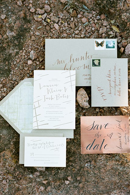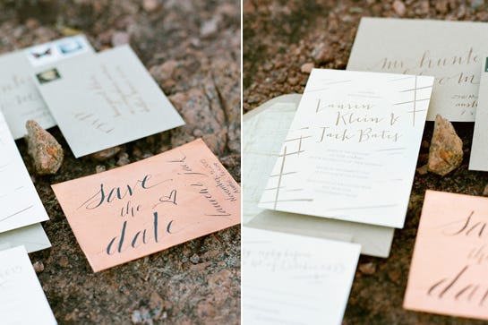 Taylor Lord, Lindsey Zamora, and a handful of other creative folks headed to the desert to shoot this dreamy inspiration shoot. Metal and branches blended with lush florals on a tablescape set with beautiful calligraphy stationery.