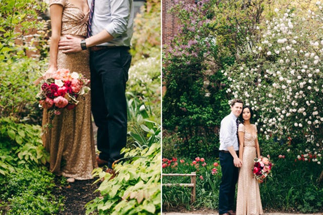 Three things to know about Alanna + Rob: She wore a champagne sequin wedding gown that she designed herself; they skipped wedding cake and opted for candied bacon on a stick; and the two of them met on a volunteer trip to Kolkata, India.