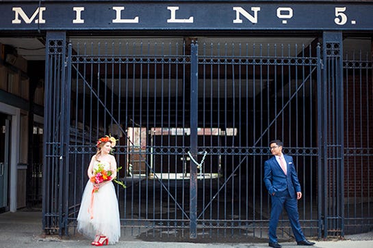 New England brides, here’s a venue to put on your radar: Mill No. 5. Chhavy Sinuon of Style This Shindig says it’s quite the gem in Lowell, MA. The deets: It’s a textile mill building that’s being revived as a mixed-use space, and they’re rebuilding with salvaged materials like a door from Dr. Suess’ house and over 400 year-old German façade (older than the U.S., if you can believe that!).