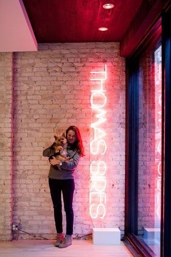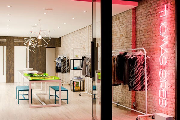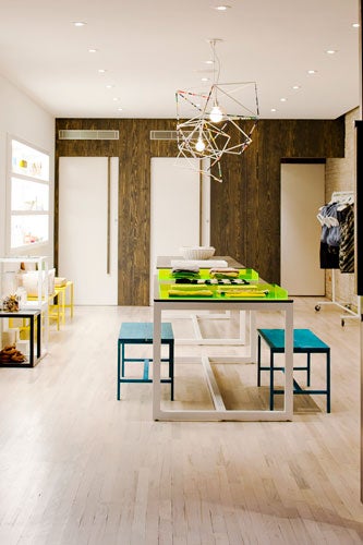Wearable, minimalist clothing with quirky touches that make each piece truly unique is the backbone concept to Thomas Sires' women's ready-to-wear line. The brand—backed by two expert friends in fashion, Loeffler Randall alums Fiona Thomas and Allison Sires— showcases artfully-crafted looks displaying the perfect degree of whimsy, like French terry cropped sweaters and printed silk Shibori dresses that definitely aren't sold at, say, Macy's. The line is now available at their new Nolita lifestyle store of the same name, which just opened officially on Saturday. Designed by architect Jeremy Barbour of Tacklebox Archiecture and furnished with materials like lucite, neon, and lacquer, the Elizabeth Street boutique resembles the progeny of a late night-threesome between high-end museum store at Palais de Tokyo, CB2, and Soho's Kisan. Thrown into the mix is a highly-curated mix of jewelry, home accessories, and fun doo-dads (globe emblazoned soccer balls anyone?) from an international hit-list of designers, making it the perfect place to pick up last-minute stocking stuffers. From the dressing rooms we wish were our apartments, to the Iacoli & Mcallister lighting fixtures, to an Eiffel Tower pillow we want, want, want, Elizabeth Street shopping just got a little more dangerous.