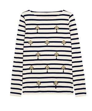 J.Crew Embellished Striped Cotton-Jersey Top, $90, available at Net-A-Porter; Boy by Band of Outsiders Short Trench, $577.59, available at La Garçonne; rag & bone/JEAN Boyfriend Bromley, $150, available at Aritzia; Jeffrey Campbell In Love Flat, $95, available at Nasty Gal; Giles & Brother Archer Cuff, $175, available at Giles & Brother; Mackage Novaki Crossbody, $225, available at Club Monaco.