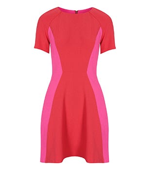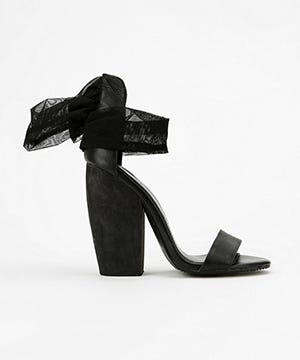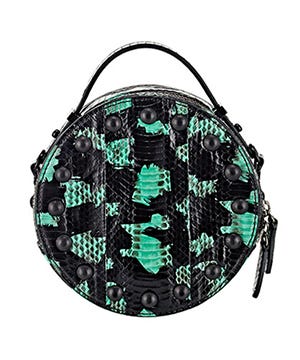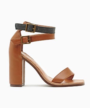 Topshop Colorblock A-Line Tunic, $96, available at Topshop; UNIF Pyre Ankle-Tie Heel, $149, available at Urban Outfitters; J.Crew Crystal Button Earrings, $35, available at J.Crew; Catbird Alphabet Ring, $96, available at Catbird; Deborah Lippmann Shimmer Nail Lacquer in Dream a Little Dream, $17, available at Sephora; Loeffler Randall Circle Bag, $198, available at Loeffler Randall.