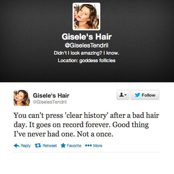 Apparently, we're not the only ones who think so. Yesterday, The Cut reported on a new parody Twitter handle — @GiselesTendril — based solely on respect and adoration of the model's waves. Looking for tweets about Tom Brady? Not here. Wanna see Instagrams from Gisele's life? Not in @GiselesTendril's house. Here, it's all Gisele hair, all the time. And, we totally respect that. So, we went ahead and found the five best Twitter accounts, all devoted to celebrity hair.