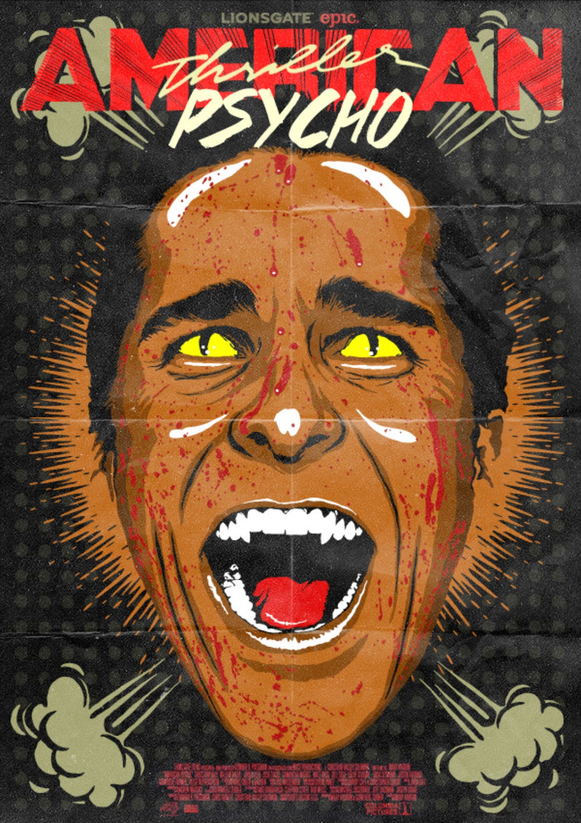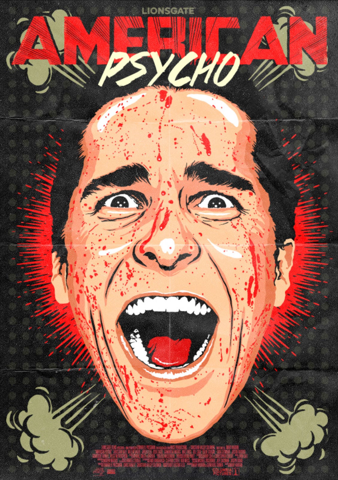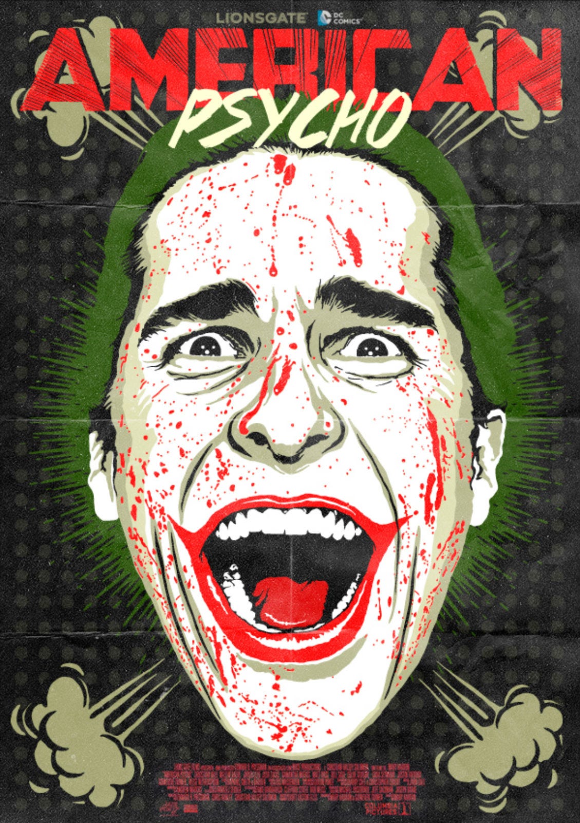 In American Psycho, Bateman lives the ultimate double life: millionaire playboy by day, bloodthirsty serial killer by night. So, it makes perfect sense that Butcher would reimagine the iconic image of Bateman screaming with a face full of blood, as other American icons with double identities. Aside from the Joker, who's just straight nuts, the artist includes famous dual personalities like Captain America, Walter White, and Gene Simmons. And, in a nod to meta lovers everywhere, he even includes Bale as Bateman as...yes, Batman. Don't worry, our heads are spinning, too. (Behance)
