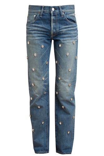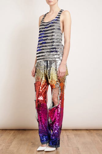 Per usual, Kloss and Dunn dressed to impress in embellished "Vogue" denim and dramatically cool thigh-high boots, respectively. But, as you can see, their attention-grabbing styles strike two very different notes. While Karlie's Ashish jeans were a cheeky nod to the occasion, Jourdan's footwear was super sexy. So, readers, tell us: Which supermodel's outfit do you prefer? This editor is leaning toward Team Karlie, but it's a tough call that really depends on your sartorial preference. Fire away in the comments — and shop similar styles in the slideshow, too, if you so desire.