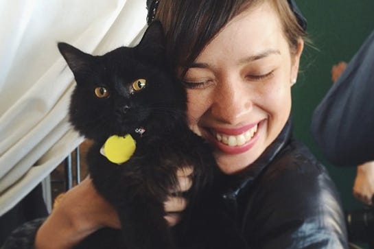 Outside the pop-up Purina ONE Cat Café on Bowery, a muscular man named Jorge stands at the entrance. He faces a line of about 100 people that extends to Elizabeth Street. With his towering presence and official Purina T-shirt, it's easy to mistake Jorge as a hired doorman. But, he explains, "I'm not the bouncer. I'm the entertainment." It's certainly a more appropriate title for him. As he gives the crowd updates on wait times, it's clear he's already won their affection. "No one's waited more than four hours, so far," he says. And, even those who have waited the most find it impossible to be frustrated with Jorge.