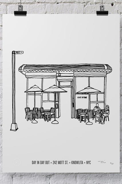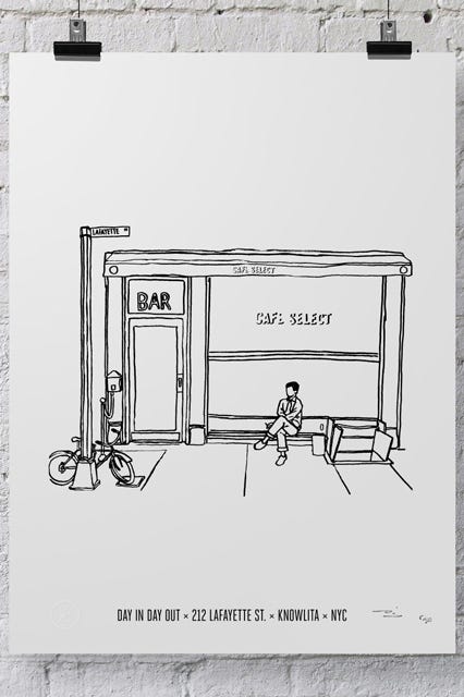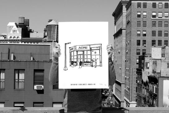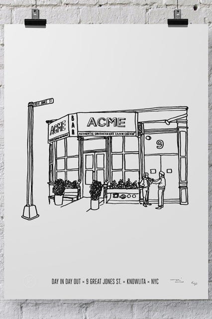 In NYC, it feels like there's a new restaurant opening up every day. While we love checking out the latest eateries, we've also become attached to a handful of "old reliables." In fact, we've been known to forego a night at a trendy new establishment in favor of an oldie-but-goodie. And, it looks like we're not alone. Brooklyn-based artist Massimo Mongiardo has created illustrations of some of our favorite dinner-time go-tos: ACME, Café Gitane, Café Select, La Esquina, and The Smile.
