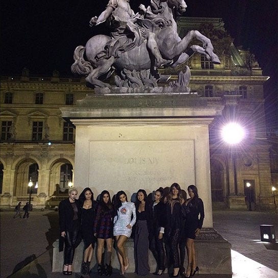An intimate group of 20 enjoyed what Kim called a "last supper" and romped around Paris in expensive clothing with Instagram at the ready. The future Kardashian-West transformed herself into the beaming bride-beacon she is in a super-intricate Balmain dress. The rest of the Krew kept it classy in dark styles (talk about kontrast). It doesn't look like the pack strayed too far from the Louvre. Or, maybe all their smartphones died leaving them Instagram-less. Good thing the entire world has unleashed a battalion of paparazzi to capture their every move #latergram. (Glamour)