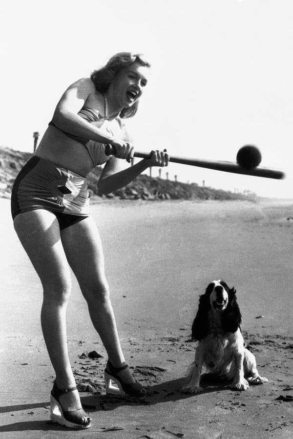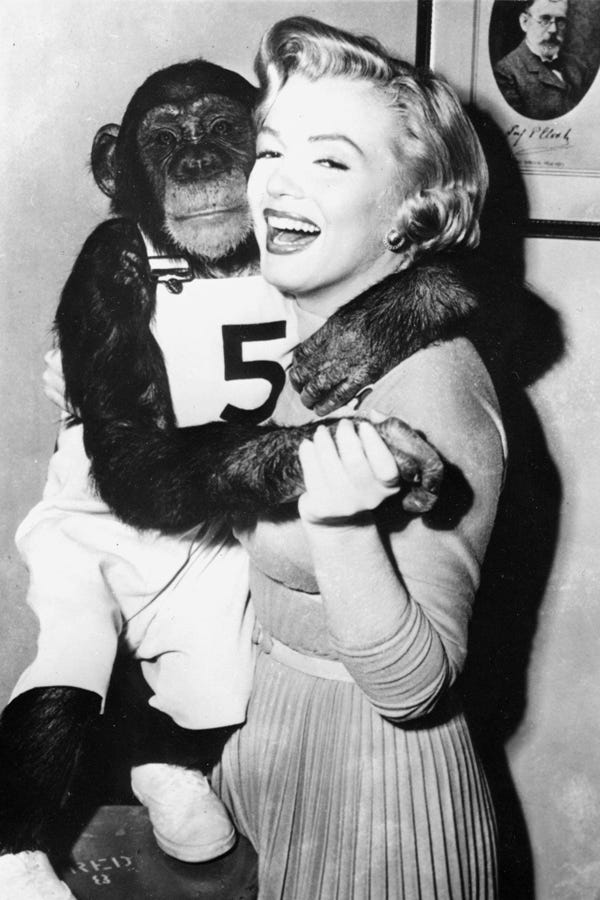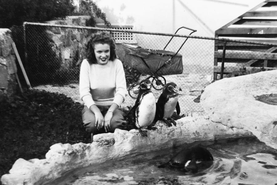 Alas, the photos we've got for you today don't reveal any pooches with hooch. They do, however, show Monroe looking absolutely delighted to be in the company of dogs, penguins, and the occasional ape. Click through to view our tribute to one of Hollywood's most glamorous animal lovers on her special day.