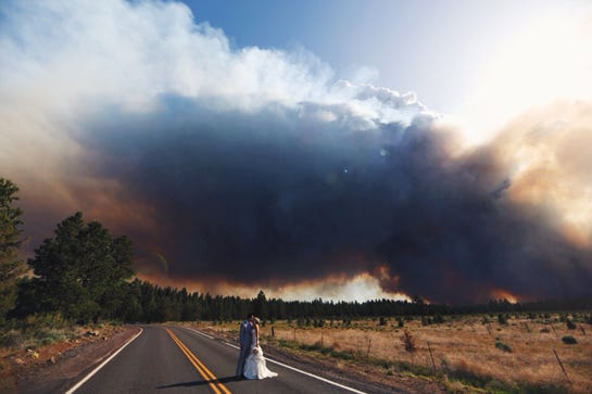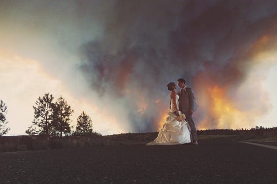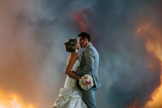 At first glance, this looks like a snap of Scarlett O'Hara and Rhett Butler in that famous scene in Gone With The Wind. Or, maybe a real-life Cam and Mitchell. Both so close, but not quite. Meet Mr. and Mrs. Wolber, newlyweds who might go down in nuptial history for having the most dramatic (non-fictional) wedding photos of all time — in front of a real wildfire.