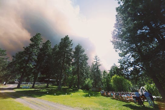 Fire marshals interrupted their walk down the aisle during their afternoon ceremony on a ranch in Bend, OR. With the Two Bulls wildfire fast approaching, the entire party had to evacuate, fast. The guests and family relocated the ceremony to a park in downtown Bend to finish the vows. But, in the midst of the tragedy, (and once the guests were safe), the couple and photographer Josh Newton stayed behind for a (hot) session in front of the distant flames. Click through for the rest of the wedding photos.
