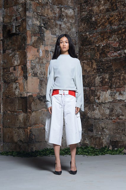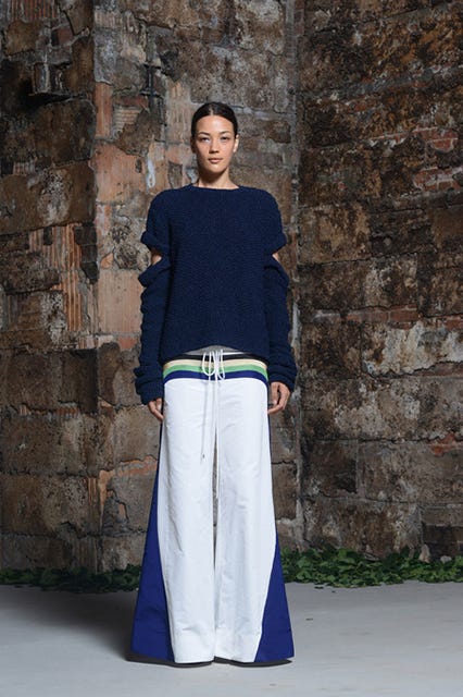 In the recent debut of her resort '15 collection, Assoulin delivered the kind of bright-colored, structurally unique, red-carpet-moment-making designs for which she's already become known. However, what stood out most for us was the preponderance of surf shorts. Featuring the same wide stripes and lace-up ties you'd see on any seaside boardwalk, these shorts have been lengthened, widened, and paired with Assoulin's elegant knits and pointed pumps.