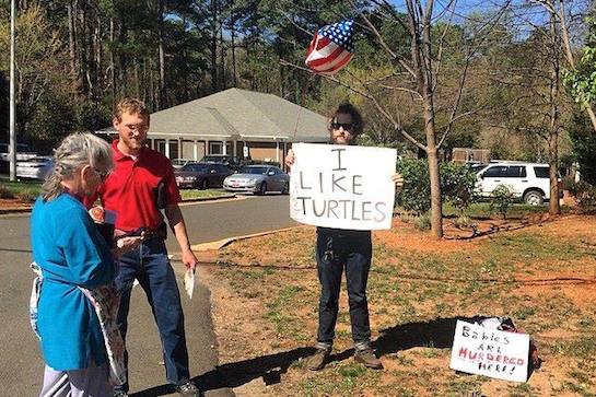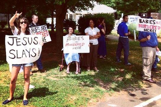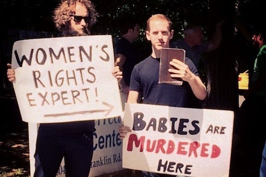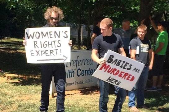 On Saturdays, Grayson and Tina Haver Currin run errands — rather, one particular errand, which they document on their blog, Saturday Chores. Despite what the blog's name suggests, this weekend activity is anything but mundane: The Raleigh, NC husband-and-wife team heads to the local women's clinic to counter-protest the anti-abortionists who congregate there. The Haver Currins even tote their own handmade signs, eclipsing the pro-lifers' misguided messages with humor. The contrast of the couples' contrarian and/or nonsensical signs against the anti-abortionists' accusations of murder is hilarious and surprisingly poignant.