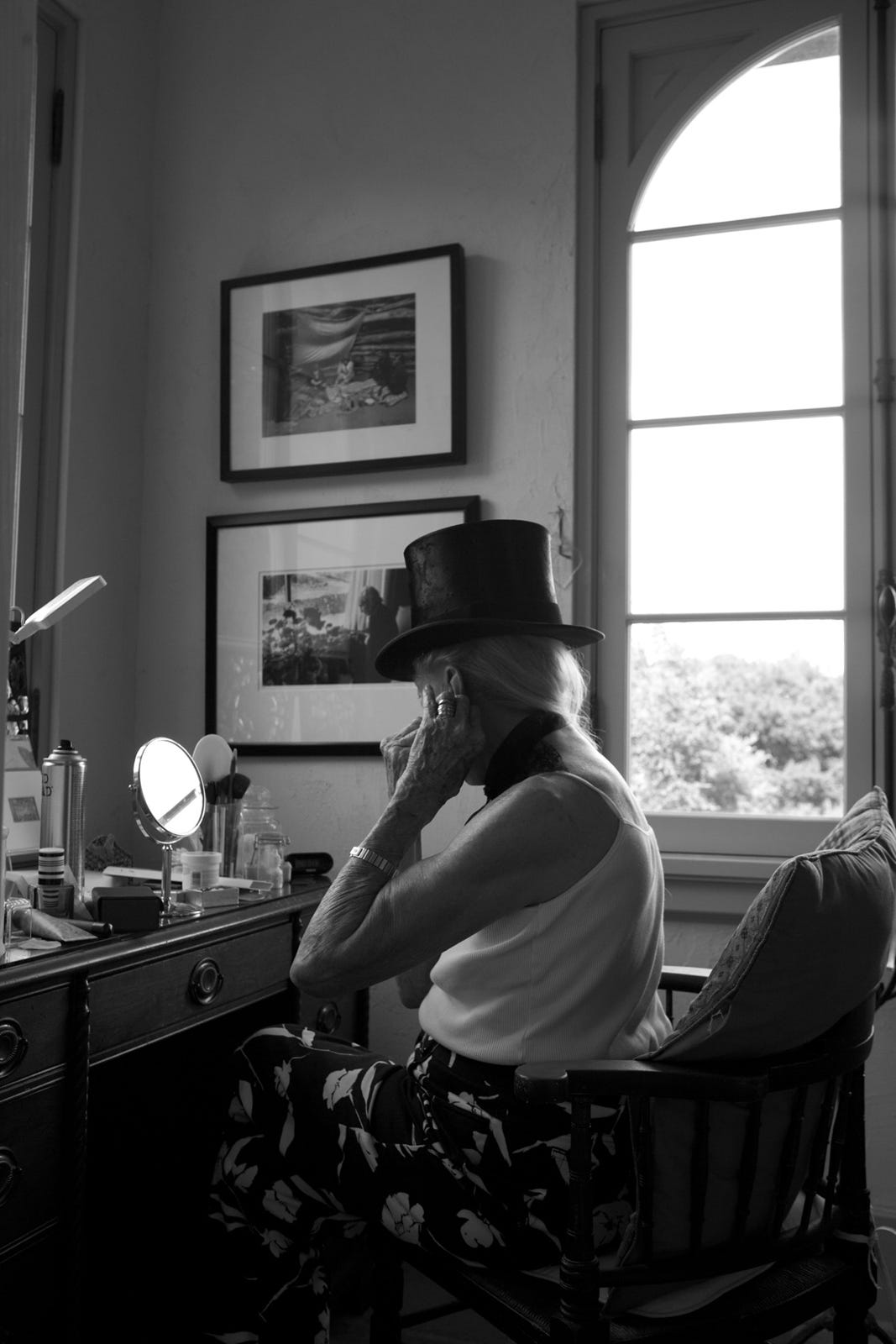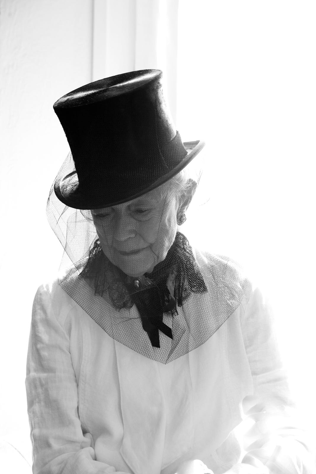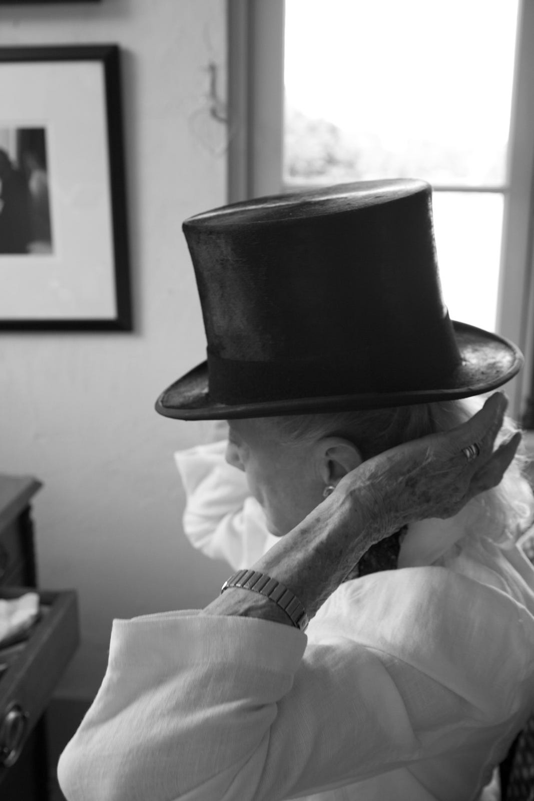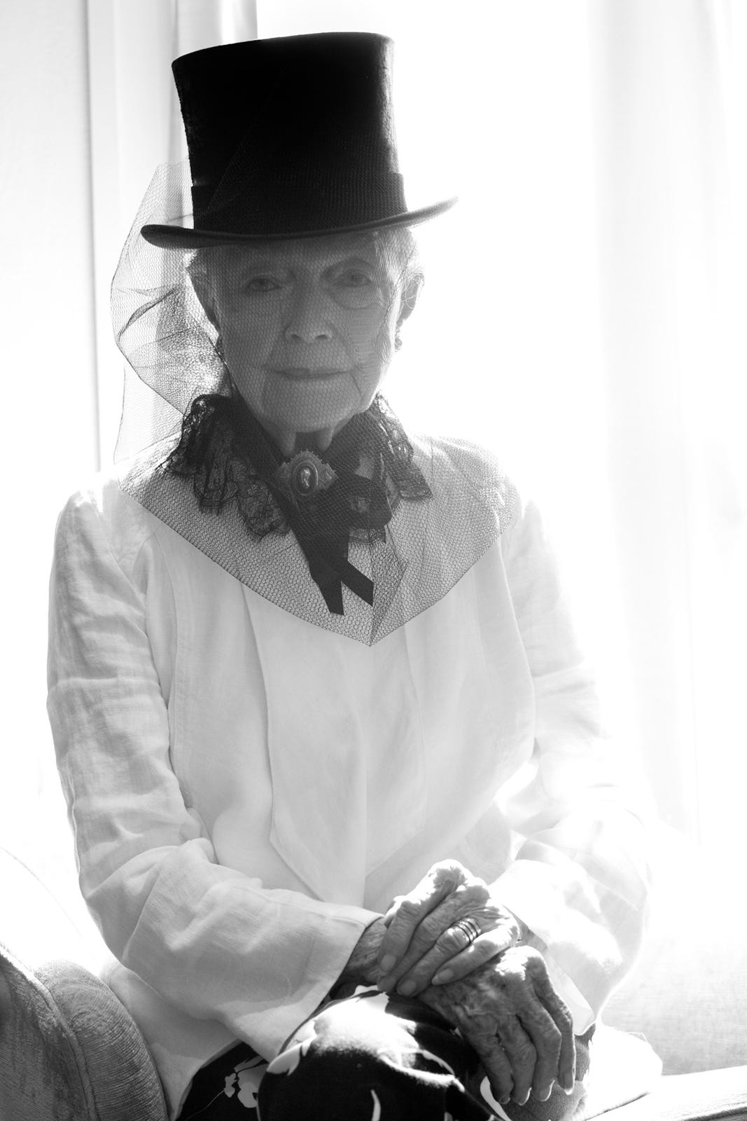 While running errands in the afternoon with my mother, I received a call from Sue. She was inspired by a Ralph Lauren advertisement, and wanted me to photograph her. She dressed herself in a swath of black tulle from her mother's sewing collection, a Lock & Company Hatters top hat from London, a Wolford lace collar my mother had given her, a vintage brooch, and I placed a chair near a window in her study. The images we took are some of my favorite to date. The smile that spread across Sue's face while viewing the photos on my laptop was truly priceless.