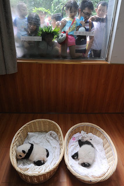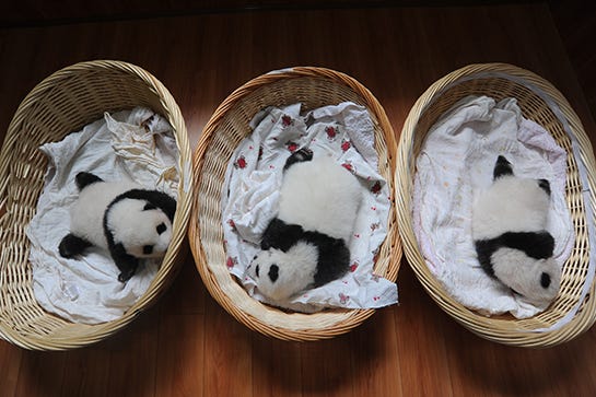 More importantly, they're bona fide bundles of joy for conservation efforts to save the endangered species from extinction. According to the World Wildlife Fund, only 1,864 giant pandas live in the wild. China, the panda's homeland, has led the way with captive breeding to revive the population — though it hasn't been easy. Female pandas are fertile only two or three days out of the year and male pandas have a tendency to become sterile in captivity. Thanks to advancements in technology, breeding and panda cubs' survival rates have improved.