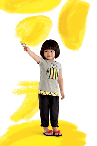 While there are a few (faux) wrap dresses in the mix, the perky colors and the fact that they're actually skorts (or drorts?) keeps them age-appropriate. And, can we talk about those incredible wrap sandals for a minute? The spring green print, simple little straps, and itty-bitty wedge heel totally kicks the cartoon-slathered kicks we wore as children to the curb. But we think the most important thing is how the lookbook highlights the way these tot togs are meant to be worn—as in, they're not showpieces you keep in a dust bag in your closet. Rather, the snaps show kids having a blast with paints, illustrating that the clothes are made to be played in, messed up, and thrown in the washer for another day of fun. This is further reinforced by the fact the simple tees, leggings, and dresses are so easily wearable, and by the way — everything is $20 and up. So, forget precious Dior pacifiers and $1,570 kiddie trenches: This, ladies and gentlemen, is how you do children's clothes right. If you try to fit into them, well we're not looking...