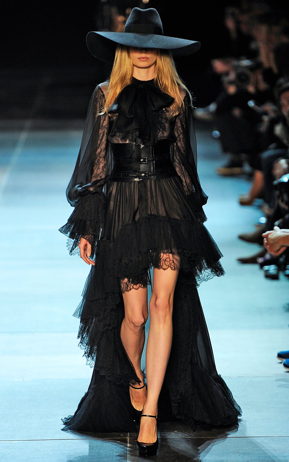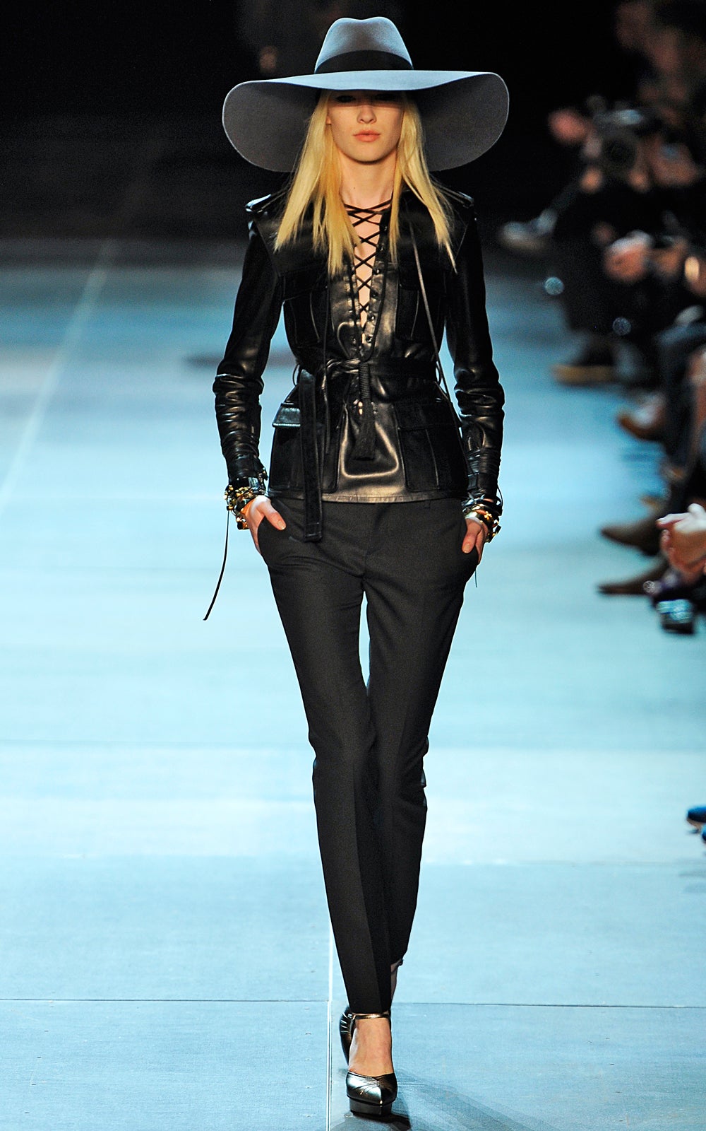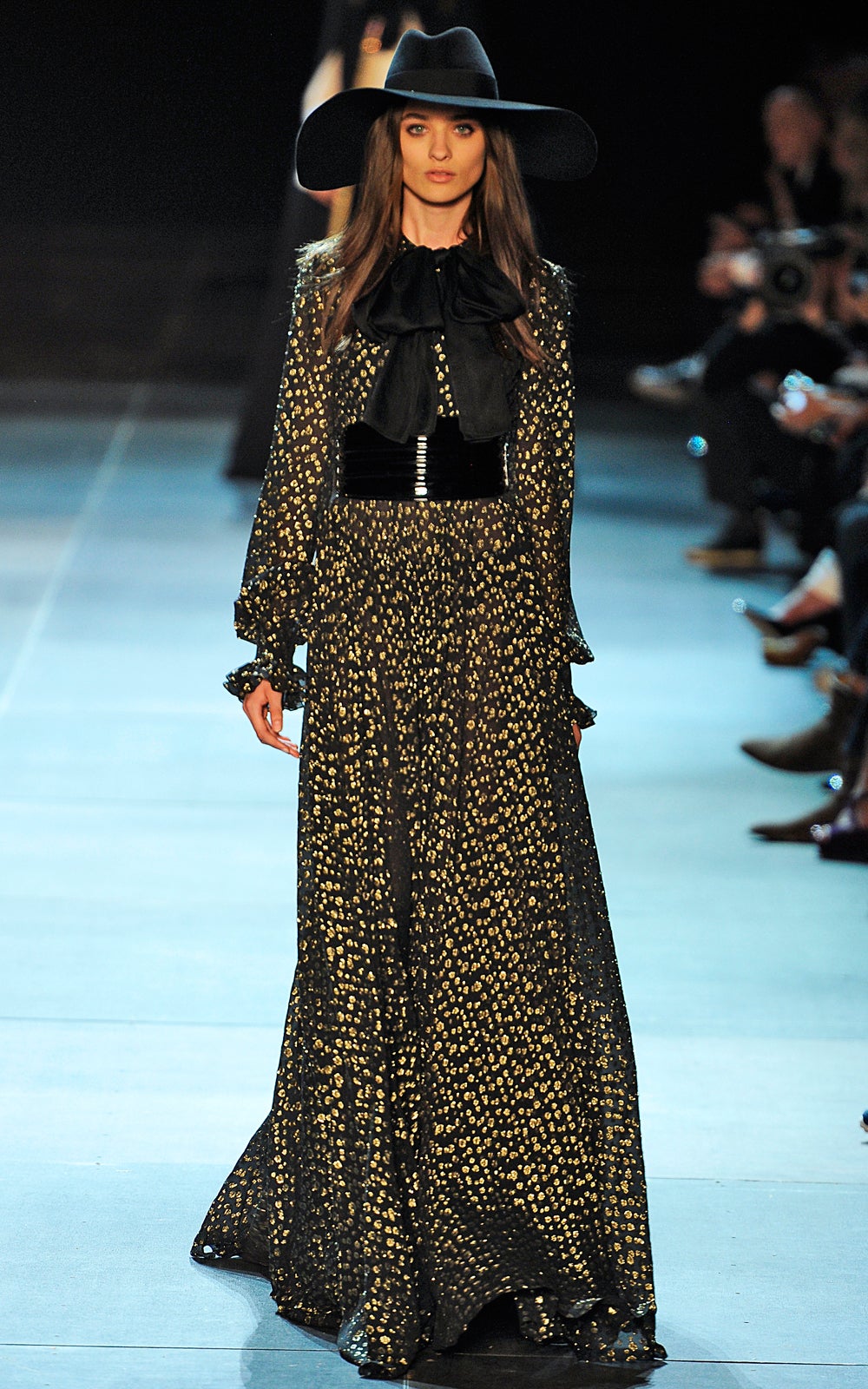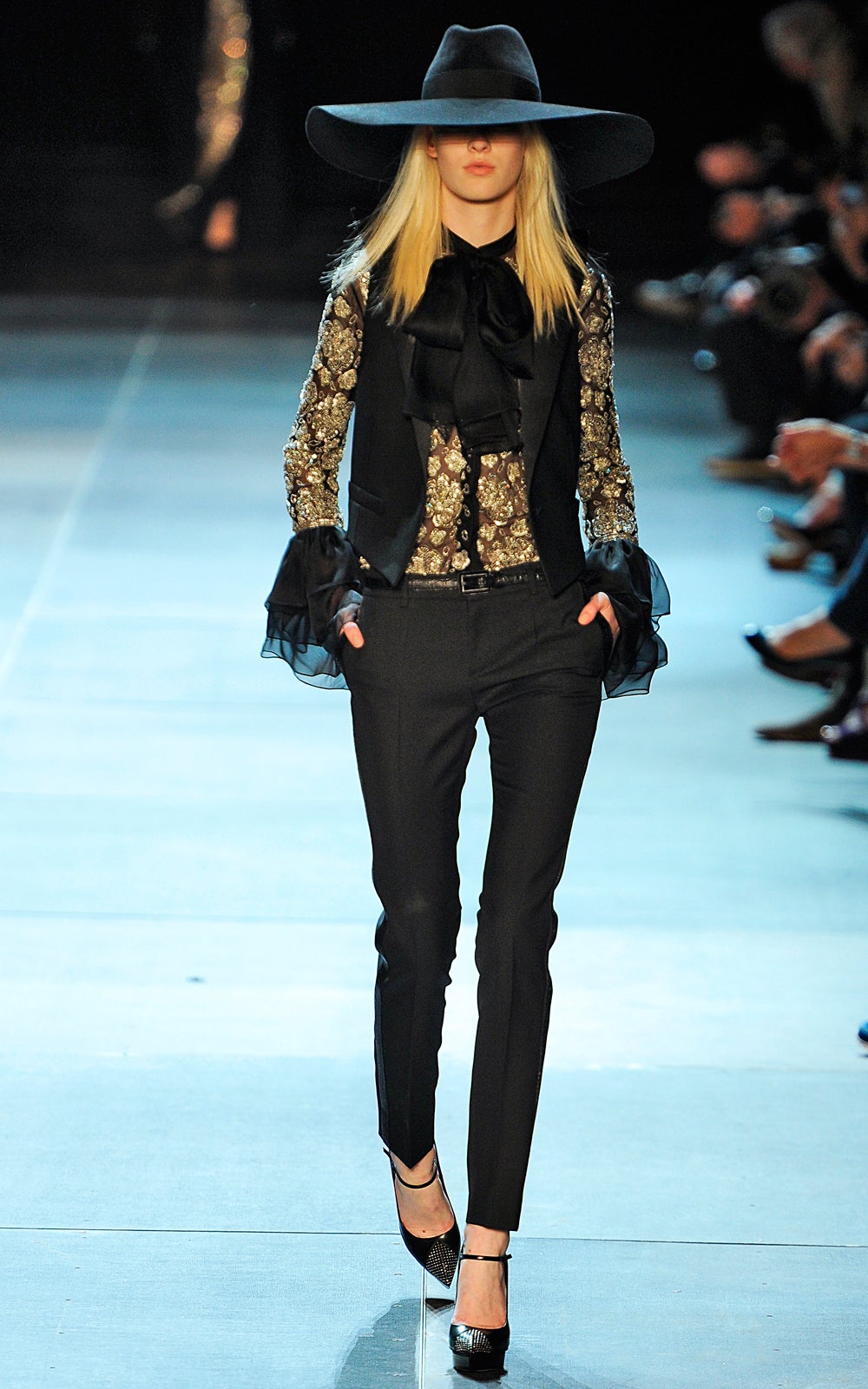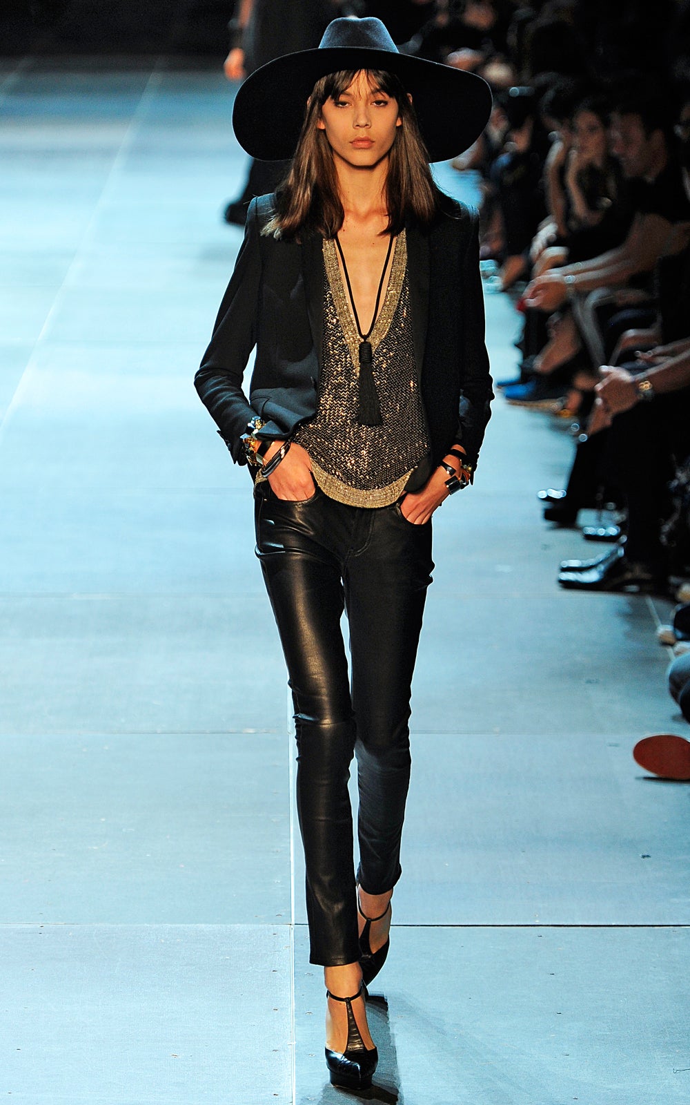 The clothes were sexy — no doubt about that. They were the kind of items Marianne Faithfull would've plucked from her own closet to seduce a Stone — sequined jackets, leather pants, corset tops, black lace. Somewhere, Stevie Nicks was calling, and Alexander Wang (who was nestled in the front row) was taking notes for his next show. Hedi Slimane had certainly set the tone for his new tenure at the house — modernity with drama and the ability to interest, to confound. Barthes would be proud.