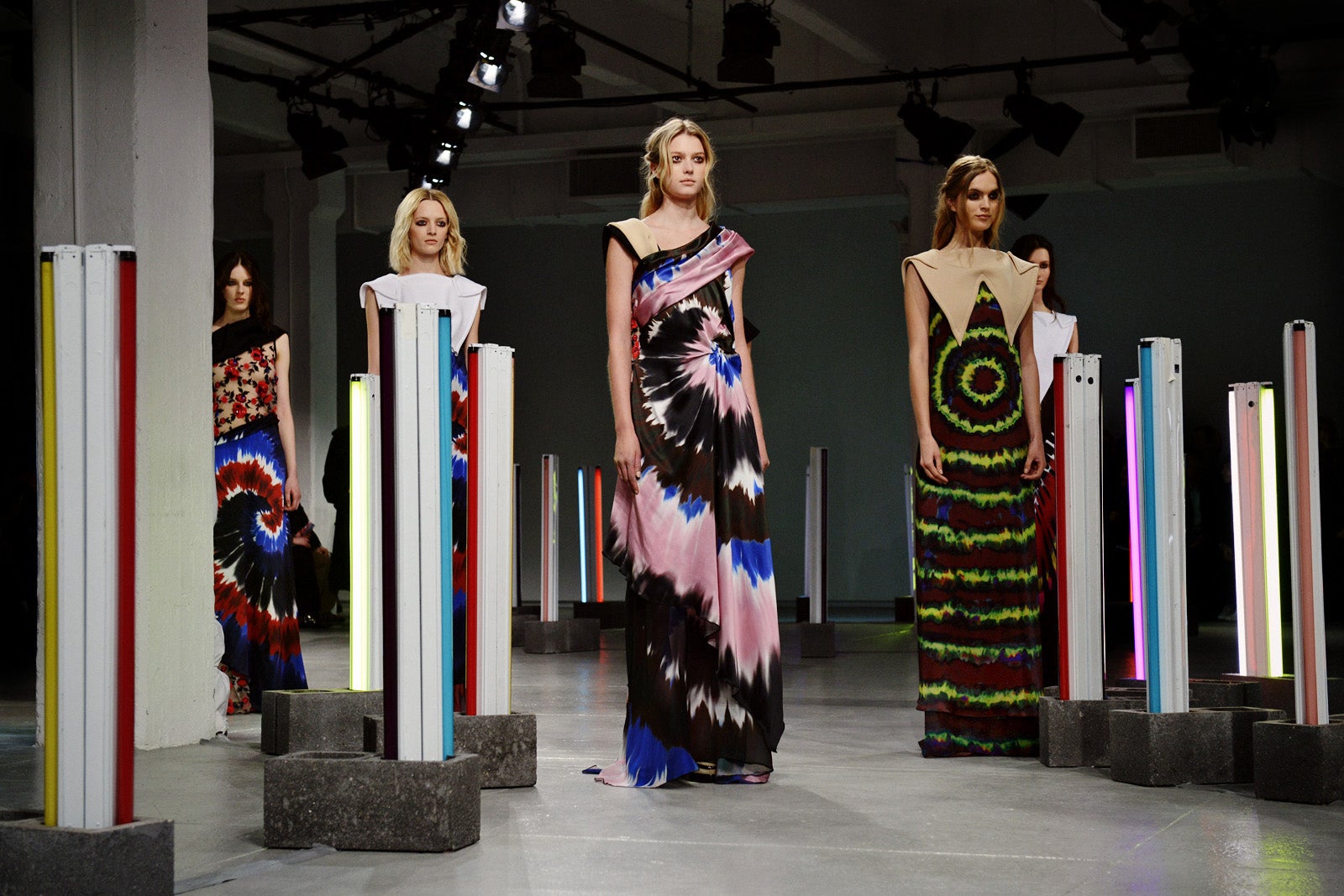 Season after season, the Rodarte sisters, Laura and Kate Mulleavy, have been known to tap into their own well of inspiration — their California roots — to inspire designs. And, like the the softer, sweeping desert vibes and leather fringe of past collections, fall '13 stayed true to the counterculture references. Instantly recognizable by electric tie-dye prints, faded denim, and crowns of braids (hair-inspo overload!), the design duo let their imaginations soar with a futuristic hippie theme that speaks to a free spirit's sartorial side.