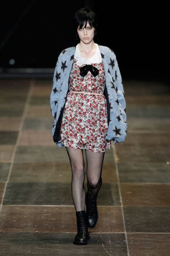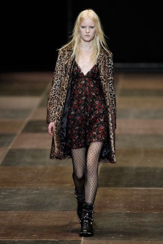 As the reviews and tweets concerning Hedi Slimane's sophomore collection trickle in, it's safe to say that all bets are off with this opinion-dividing designer. While his premiere at Saint Laurent Paris last season (which was also met with mixed reviews) gave industry vets '70s-era déjà vu with updated safari and smoking jackets, yesterday's runway show had those same folks experiencing a different type of nostalgia — this one in the vein of Marc Jacobs' dramatic stint at Perry Ellis.