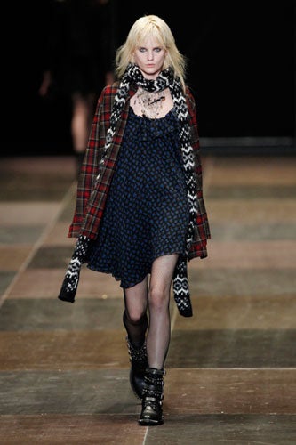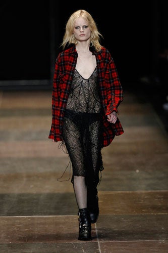 One look at the collection as a whole, and the immediate impression is Courtney Love and her iconic baby-doll dresses, paired with torn fishnet stockings and her beau's beaten-up plaids. But, there's much more below the surface of the grungy getups — the pieces are relatable to a younger audience, as are Slimane's campaigns with Beck and Sky Ferreria (who sat front row). Though the audience in Paris also featured some of YSL's original muses like Betty Catroux and Catherine Deneuve, the catwalk was obviously geared toward a new generation of dressers — the gals of high-school hallways who are always late to homeroom, not the glamorous jet-setters of yore. And, quite frankly, it makes sense, with Venice Beach being credited as the latest line's underlying inspiration, so says the sometimes-L.A.-based designer (he splits his time between Paris and Lala).