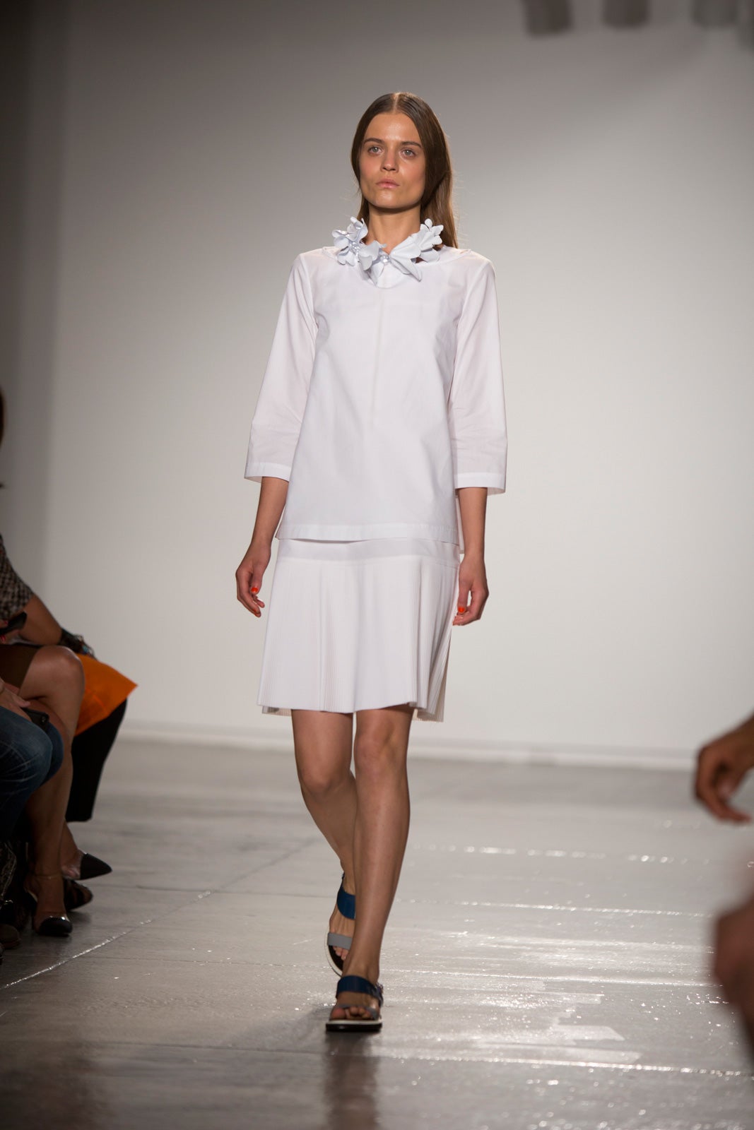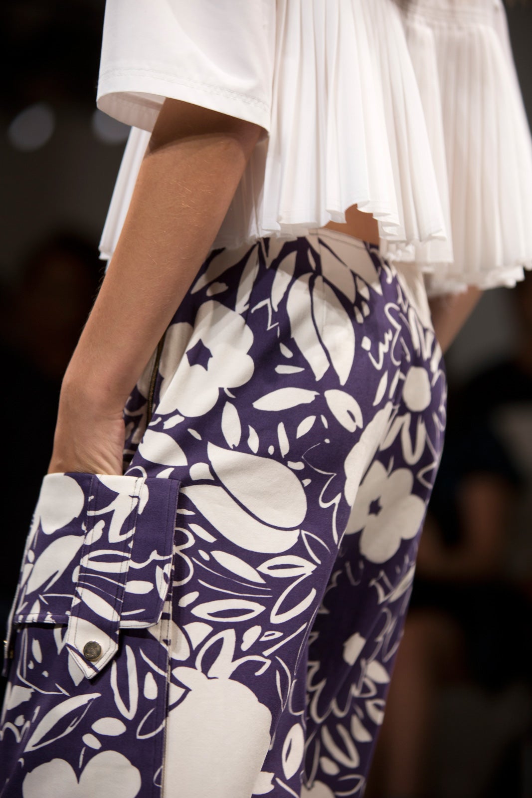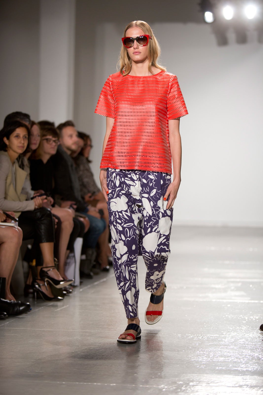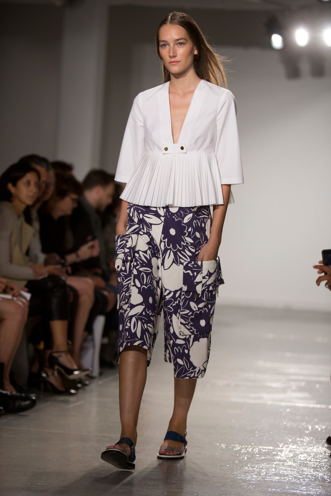 With a decidedly more serious note this season, the collection experimented with textures and sheens in many solid tones — the few prints were in a couple Kenta-cloth styles that felt restrained, not effusive. But the new territory wasn't any less daring than the previous collection — SUNO subscribes to the Miuccia Prada school of thought when it comes to length and shape (that is, pleasingly awkward in a midi-length and slightly too baggy). It's a challenging but forward-thinking silhouette, especially for the New York set. Cutout net ruffs, shower shoes, and baggy board shorts really drove home the jolie-laide theme and will be what the so-confident-she-doesn't-need-to-dress-up set will be clad in come spring. If prints were what defined the last few seasons, it may be this oversized shape that'll define the next — and we can thank SUNO for that.