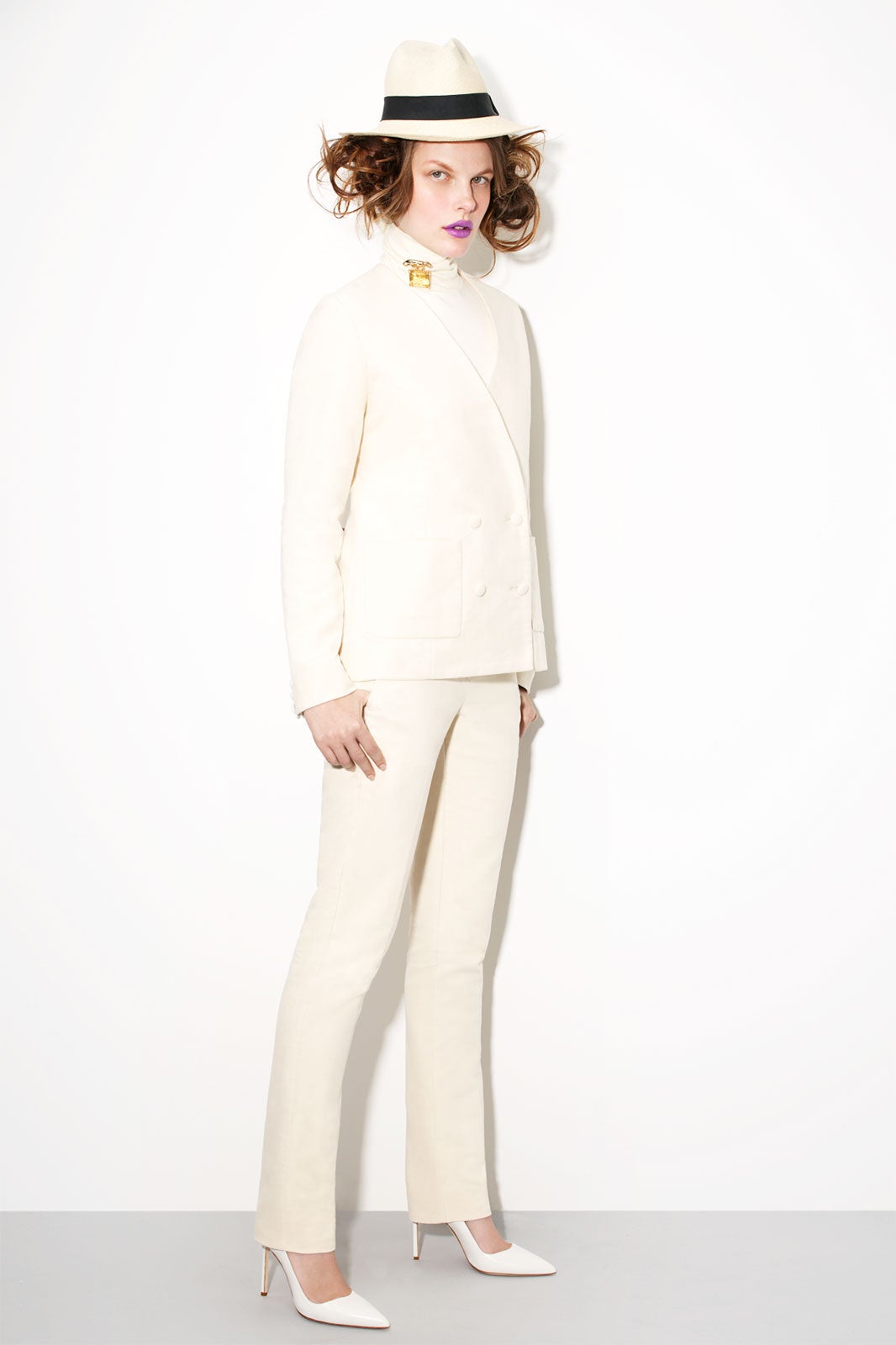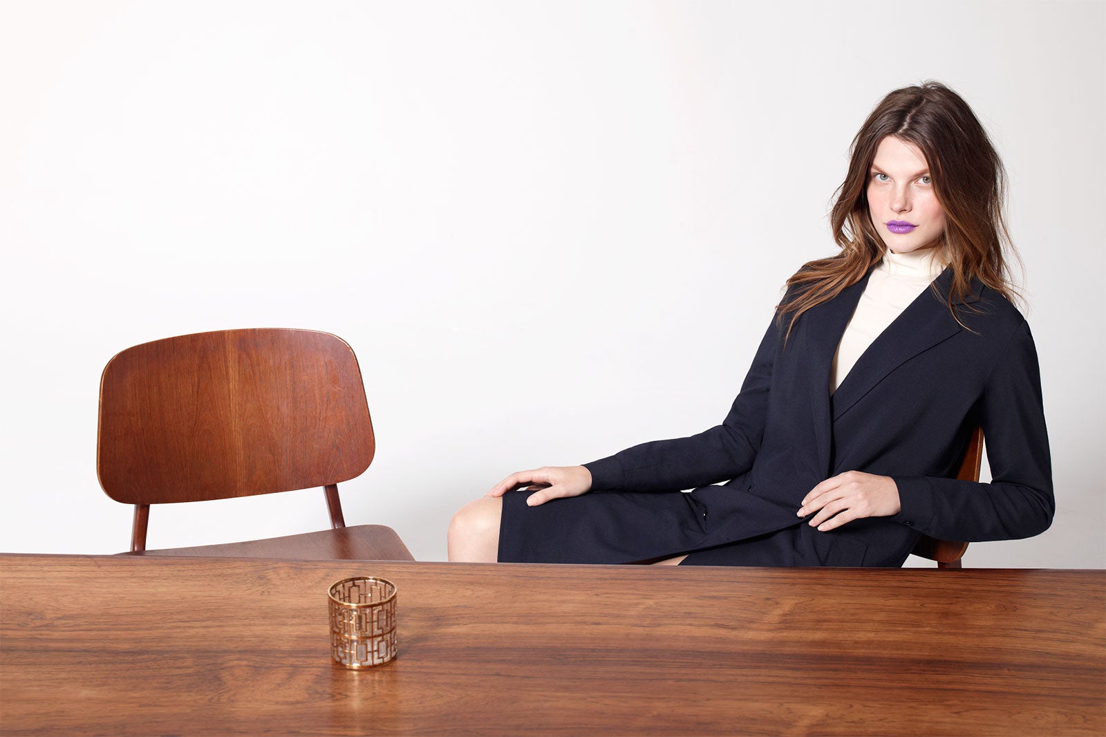 However, Kule's fall '13 collection isn't only about being prim and proper, as evidenced by models donning a rebellious swipe of purple lip stain. There's a touch of menswear-inspired pieces with an edge — think shrunken suits in a dusty, lapis-blue hue; pinstripe two-pieces that are far from a zoot suit; and, yes, fedoras. If it's about time to update your fall wardrobe (or your job, boss lady), well, then this lookbook fell into your hands at just the right time. Click ahead to see all of the looks we're eager to cozy up to during our nine-to-fives and beyond.