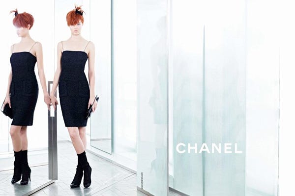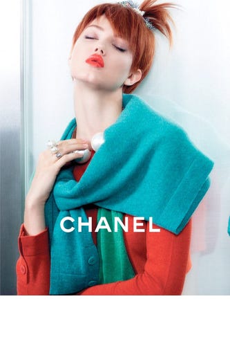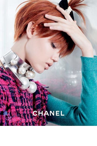 Also better in excess are the handbags. Lagerfeld puts Luss in a look that comes with three (maybe four?) Chanel chain-strapped bags piled on. Yes, she's a lucky lady. Of course, the big, pink orange elephant in the room is Wixson's chopped, bright-auburn locks in an updo that can only be rivaled by Pebbles Flintstone. Click on to see all the richly colored, mirror-reflecting snaps in the slides ahead.