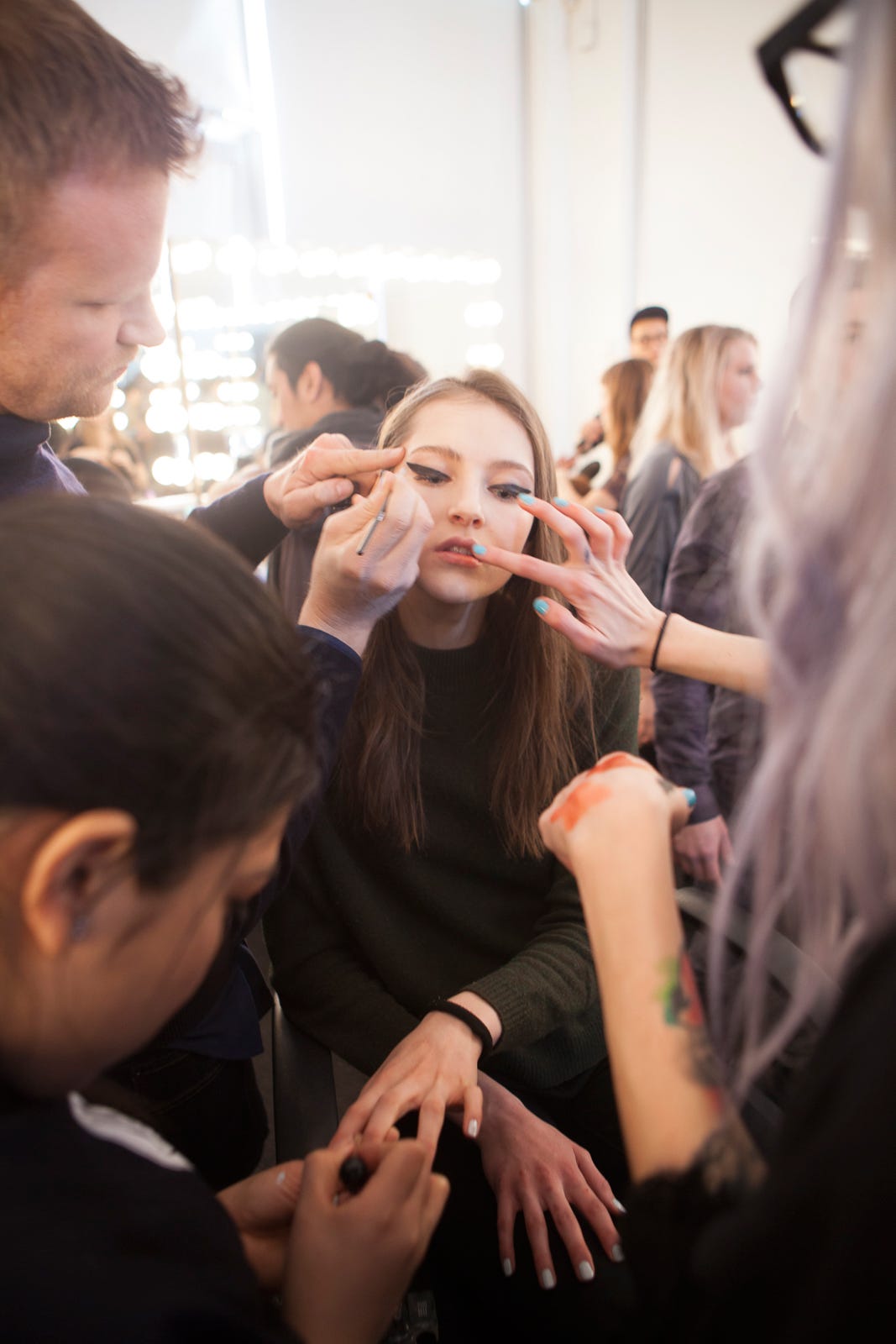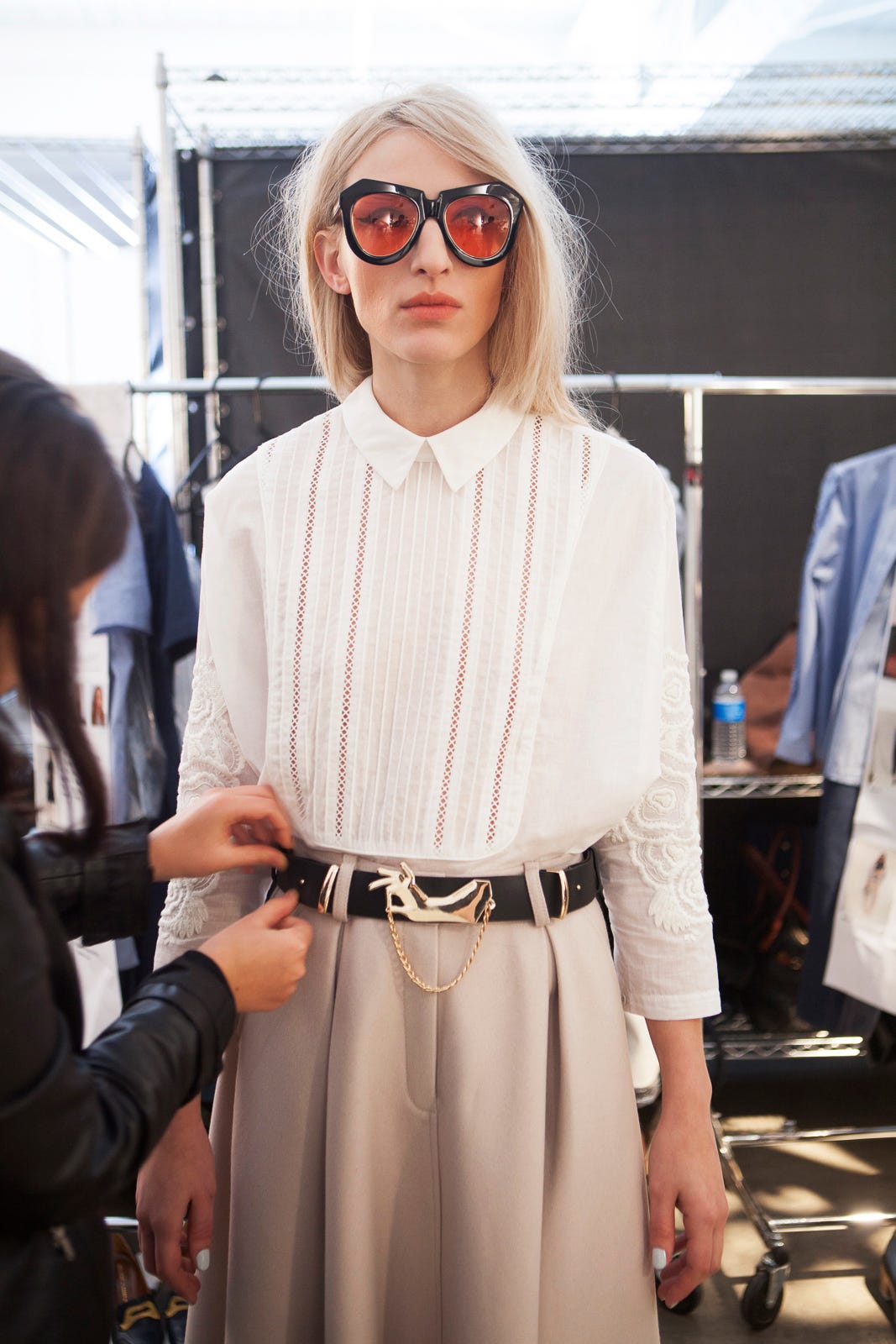 Instead of florals (though there was a great, nubby gray blossom pattern we loved), the print of this season is of raised hands. Splashed over big maxi-dresses, cast in brass, adorning a belt, or emblazoning a snuggly turtleneck in glittering sequins, the hand motif was slapped all over the collection. Literally — high fives all around.