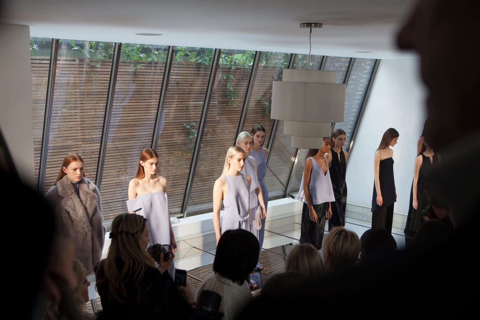 The stand-out moment, though, was the "evening wear" grouping at the end that stunned in a beautiful periwinkle shade and midnight blacks. Wide-leg trousers paired with slim-cut tunics, lean racerback frocks with origami-style folds, notch-neck midi-dresses with a subtle sheen, we could go on and on. You're never going to fidget in pieces like these, nor feel like a member of the bandage-dress army. Click through to see the whole collection (and slides 29-37 for the evening looks we love). Then, come fall, whistle while you work it.