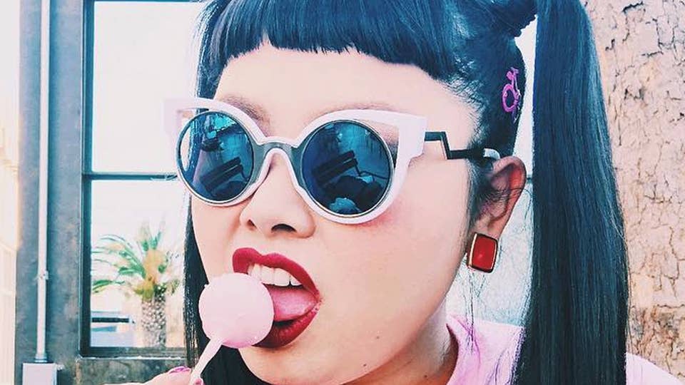 Aside from being a spokesperson and cover girl for La Farfa, Japan’s premier magazine for plus-size women (which uses animal shapes to help women identify their body type — i.e. pigeon for bustier women, penguin for bootylicious women, teddy bear for women rounder in the middle), Watanabe also has her own clothing line, which is one of the country’s only plus-specific labels. PUNYUS, which loosely translates to "chubby," launched in 2014 with the goal to provide women of different sizes with the opportunity to embrace fashion, rather than having to hide behind pieces that don’t fit (typically, she says, in Japan, it’s nearly impossible to find pieces in larger than a size medium). Though other plus-size retailers in Japan exist, Watanabe, and her U.S. representative and translator, Rei, explain that they are all very specific to a genre, like tomboy or ultra-feminine. PUNYUS however, with its red satin bomber jackets and tartan skirts, caters to everyone; Watanabe describes its aesthetic as “kind of Harajuku style, but can be dressy, and can be sexy.” Her line offers both regular and plus-sizes and has a penchant for bright, colourful designs and prints influenced by '90s hip hop, '60s style and, of course, all things kawaii.