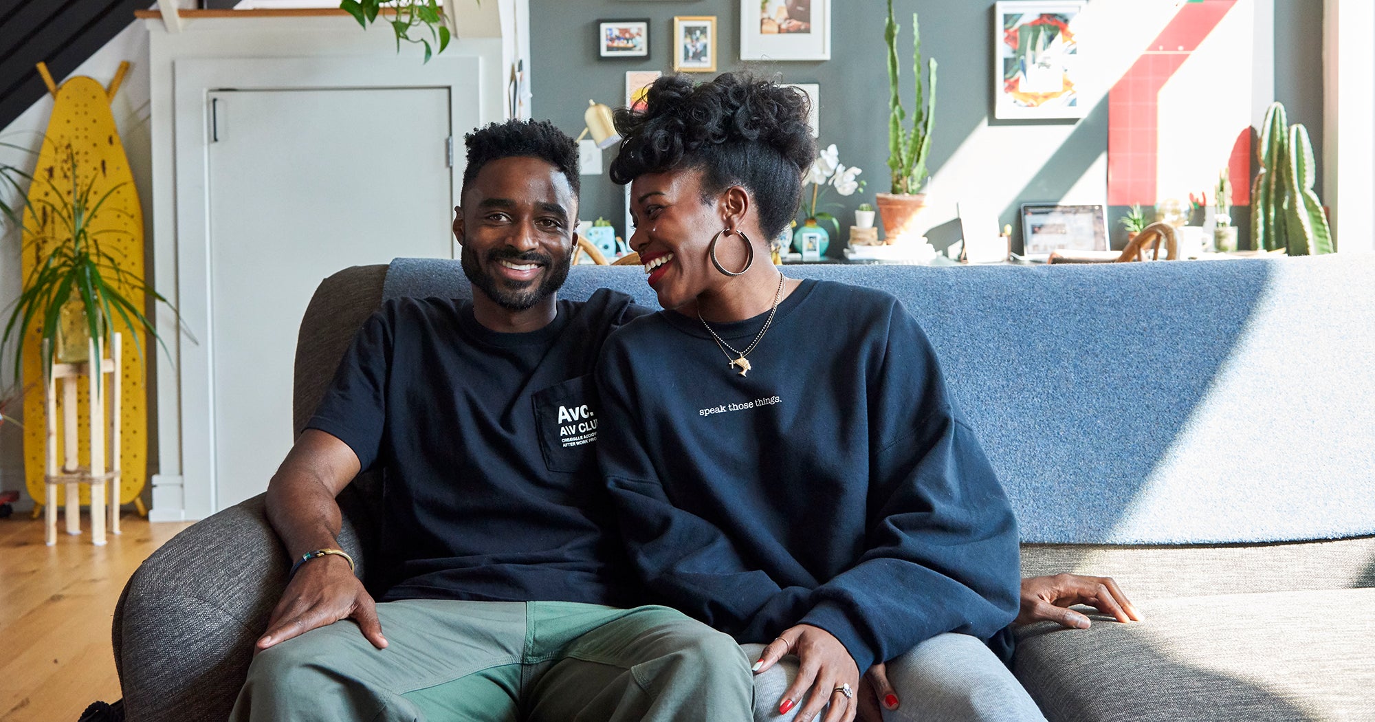 Chelsea and Warren live in Philadelphia, PA, in a bi-level two-bedroom, two and a half bathroom apartment. Their home style is industrial and mid-century modern with thrifted accents and lots of plants. Chelsea is a copywriter and runs Mia’s Closet, a clothing non-profit in Houston; Warren is a professional MLS soccer player who also runs a lifestyle and clothing brand called Creavalle. The pair got married in December of 2019.